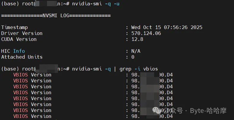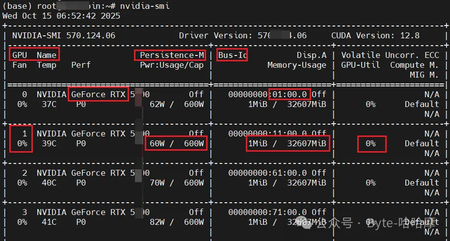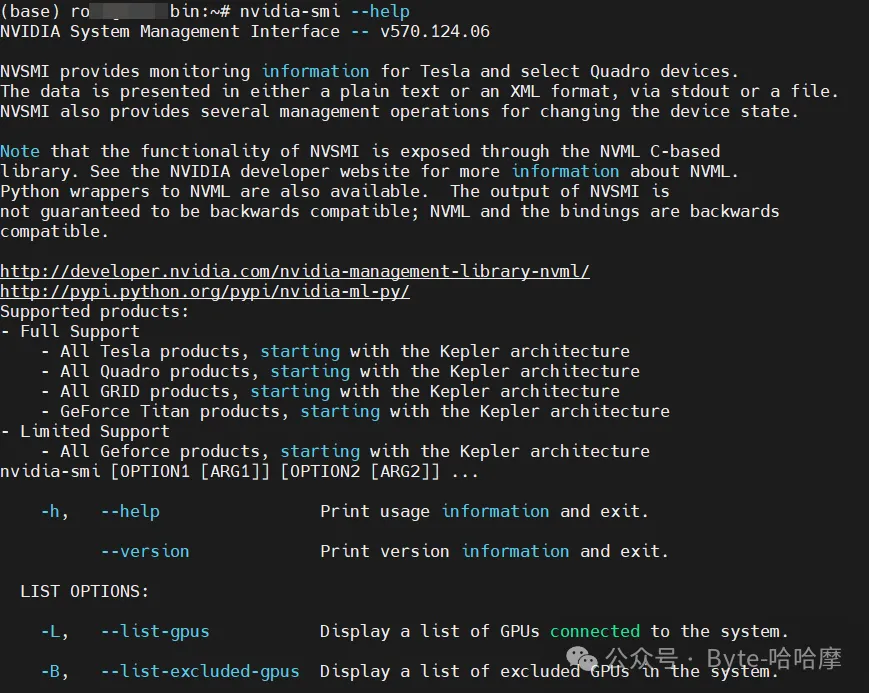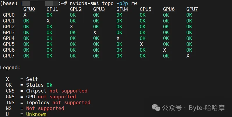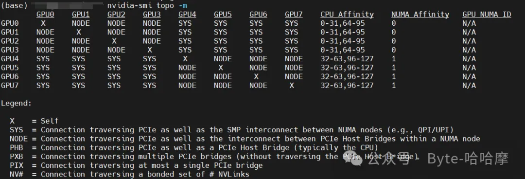 admin 一、nvidia-smi命令展示 nvidia-smi简称NVSMI,提供监控GPU使用情况和更改GPU状态的功能,是一个驱动自带的跨平台工具,只要装好驱动之后就可以正常使用。 使用nvidia-smi --help可以看到此命令的所有参数及说明。下文仅介绍GPU测试相关同学使用频次最高的一些命令和示例。 nvidia-smi 可以显示所有GPU的当前信息状态,是每一个GPU相关从业者使用次数最多也最重要的命令。 打印信息中会包括从左到右依次为: Fan风扇当前转速(进针对主动散热带风扇的GPU卡,如4090、5090等等,如果不带风扇先显示为NA); Temp(温度temperature)是当前GPU设备的温度; Perf 性能状态从最大性能P0到P8、Pwr 功耗(当前功耗/设备最大TDP); Persistence-M 持续模式默认为off,使用nvidia-smi -pm 1可以将PM打开(性能测试或者追求性能的情况下再打开),打开PM能够让 GPU 更快响应任务,待机功耗增加; Bus-Id GPU总线,domain:device.function; Memory-Usage 显存使用率(当前使用显存/总显存); Volatile GPU-Util GPU使用率,可以在进行压力测试或者性能测试的过程中,关注GPU卡是否100%占用; ECC 是否开启错误检查和纠正技术,0/DISABLED, 1/ENABLED. 推荐使用:watch -n 1 nvidia-smi (动态监控GPU卡的实时状态),在进行压力测试、性能调优过程可以对比参考。nvidia-smi -l 2 也是动态打印信息(但是打印的全屏都是一直打印不推荐) 二、nvidia 其他命令使用介绍 nvidia-smi -q -u 显示单元而不是GPU的属性 nvidia-smi -q | grep -i vbios 查看GPU的vbios版本 nvidia-smi -pm 0/1 设置持久模式:0/DISABLED,1/ENABLED nvidia-smi dmon 设备监控命令,以滚动条形式显示GPU设备统计信息 nvidia-smi dmon –d 2/3 指定刷新时间(默认为1秒) nvidia-smi dmon –f **.txt 将查询的信息输出到具体的文件中,不在终端显示 nvidia-debugdump 很好用的故障信息日志收集命令,一键打包 三、GPU设备识别及带宽速率查看 说明:Nvidia GPU卡在没有负载的时候,会自动进入节能模式,就上图所示速率为2.5GT/s。 四、查看GPU topo 使用nvidia-smi topo -m查看当前服务器设置中各GPU的硬件topo。使用nvidia-smi topo -p2p rw可以查看当前设备中配置的GPU卡是否支持P2P通信。 如下第一张图可以看出当前配置是直通配置,GPU都是挂在CPU直出的PE口(topo图中的每个矩阵值代表什么,后续可以专篇介绍)。 第二张图代表当前设备下的8个GPU设备支持P2P通信,即GPU直接的数据通信不用通过CPU,而可以直接进行显存之间的数据交换。(P2P相关技术点、原理等后续专篇分析介绍)。